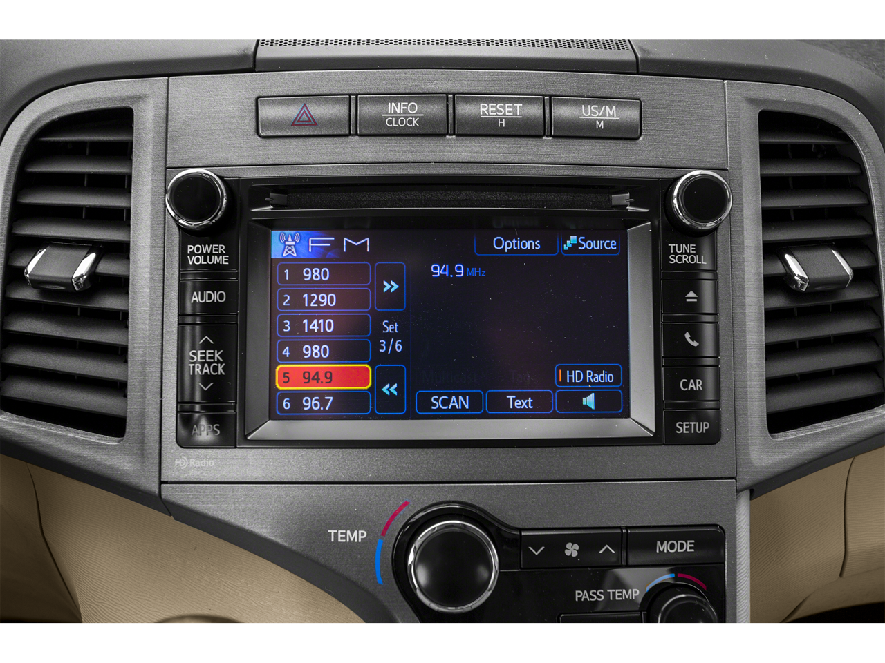 - Radio: Entune (subscription required) Audio Plus -inc: a 6.1" high resolution touch-screen display AM/FM CD player MP3/WMA playback capability 6 speakers auxiliary audio jack USB 2.0 port w/iPod connectivity and control advanced voice recognition hands-free phone capability phone book access and music streaming via Bluetooth® wireless technology SiriusXM Radio (subscription required) HD Radio HD traffic and weather in major metro areas and integrated backup camera display w/projected path